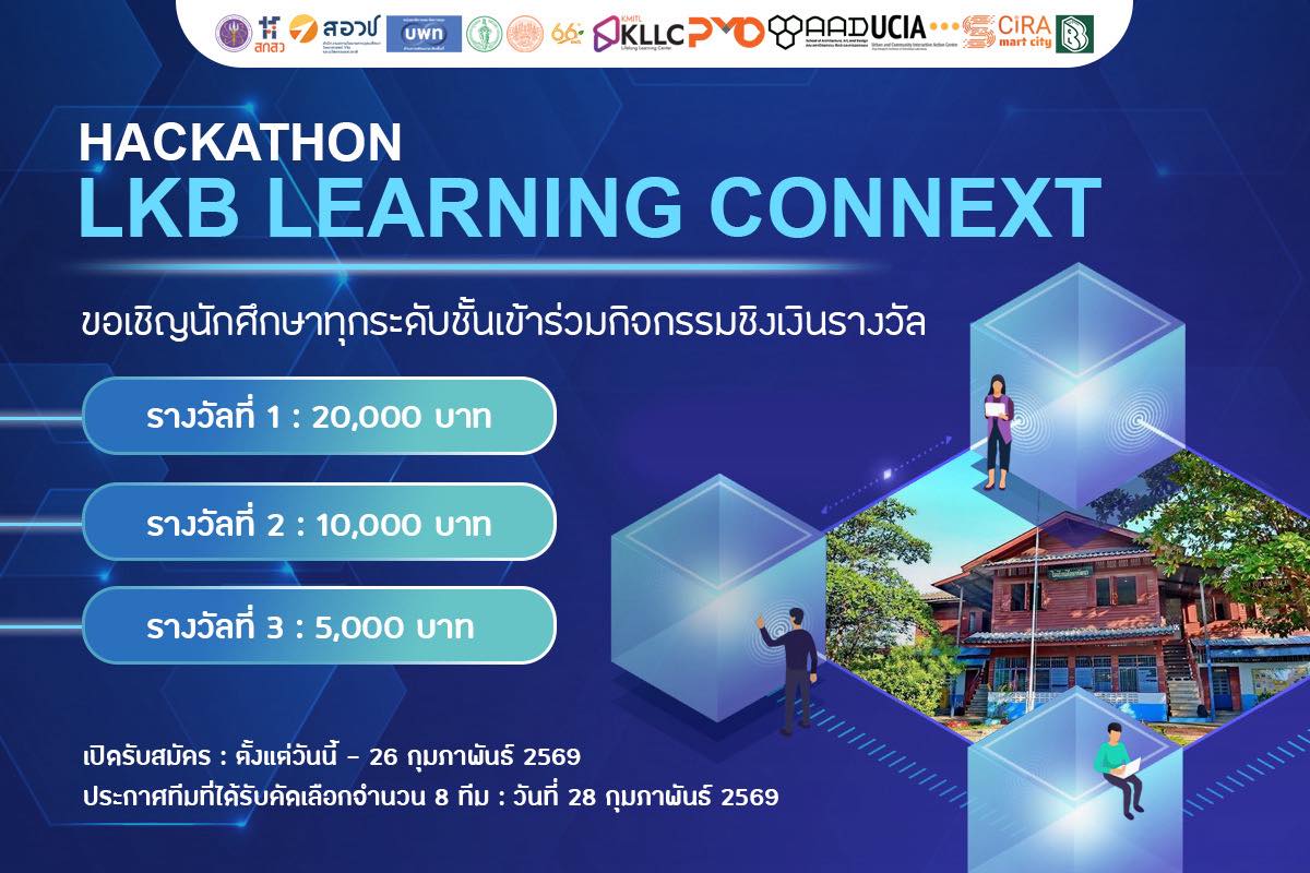Ladkrabang Learning ConNext HACKATHON ร่วมกันคิด ออกแบบ และสร้างสรรค์พื้นที่การเรียนรู้แห่งใหม่ไปด้วยกัน! February 16, 2026February 16, 2026sayjai.wa@kmitl.ac.thข่าวประชาสัมพันธ์ มาแล้ววววว! กิจกรรม Ladkrabang Learning ConNext HACKATHON วันที่ 6 – 7 มีนาคม 2569 สิ้นสุดระยะเวลาการรับสมัคร 26 กุมภาพันธ์ 2569 รับสมัครเพียง 8 ทีมเท่านั้น ประกาศผลทีมที่แข่งขันใน วันที่ 28 กุมภาพันธ์ 2569 มาร่วมกันคิด ออกแบบ และสร้างสรรค์พื้นที่การเรียนรู้แห่งใหม่ไปด้วยกัน! จัดที่ โรงเรียนศึกษาพัฒนา และ อาคารบูรณาการ คณะสถาปัตยกรรม ศิลปะและการออกแบบ (KMITL) พบกับเงินรางวัลมูลค่ารวมกว่า 30,000 บาท! รางวัลที่ 1: 20,000 บาท รางวัลที่ 2: 10,000 บาท รางวัลที่ 3: 5,000 บาท รางวัลชมเชยสำหรับผู้เข้าร่วม ลงทะเบียนเข้าร่วมกิจกรรมได้ที่: ลงทะเบียนที่นี่ link: https://docs.google.com/…/1FAIpQLSeSRo6A_tC…/viewform… มาร่วมเป็นส่วนหนึ่งในความสนุกและสร้างสรรค์ไอเดียใหม่ๆ ร่วมกันนะ จำนวนคนดู : 18 FacebookTwitterLine